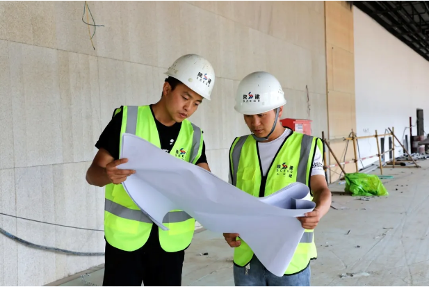 圖為閆雄雄(右)在施工現(xiàn)場對設(shè)計圖紙進(jìn)行交底
